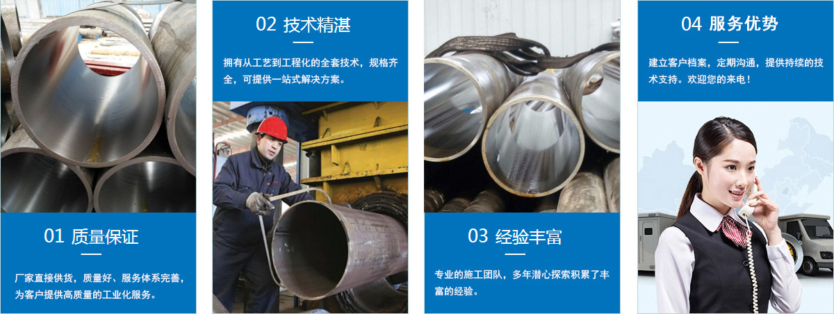 目前公司品種規格為:內徑直徑30mm—300mm,壁厚為2mm—40mm。技術條件為:內孔精度H5—H10,內孔粗糙度Ra≤0.63um,直線度≤0.3mm/m。鋼號是20#—45#、16Mn、27SiMn及部分低合金鋼,標準GB8713-88。規格為40-300*2-40MM,長度為2-12M的各種類型油缸管,年產銷售能力3萬噸。公司設備先進,工藝優化,檢測手段完善。